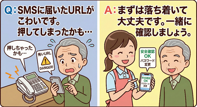まずは落ち着いて大丈夫です。スマホの状態を一緒に確認し、必要ならパスワード変更などを案内します。今後は、あやしいSMSやサイトを止める設定も入れられます。