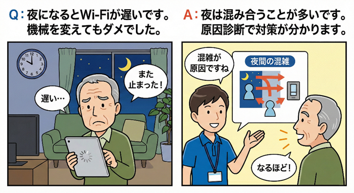 最近は夜だけ混み合って遅くなることも多いです。機械の問題ではない場合もあります。状況を聞けば対策が分かるので、交換せずに良くなることもあります。